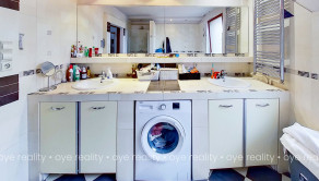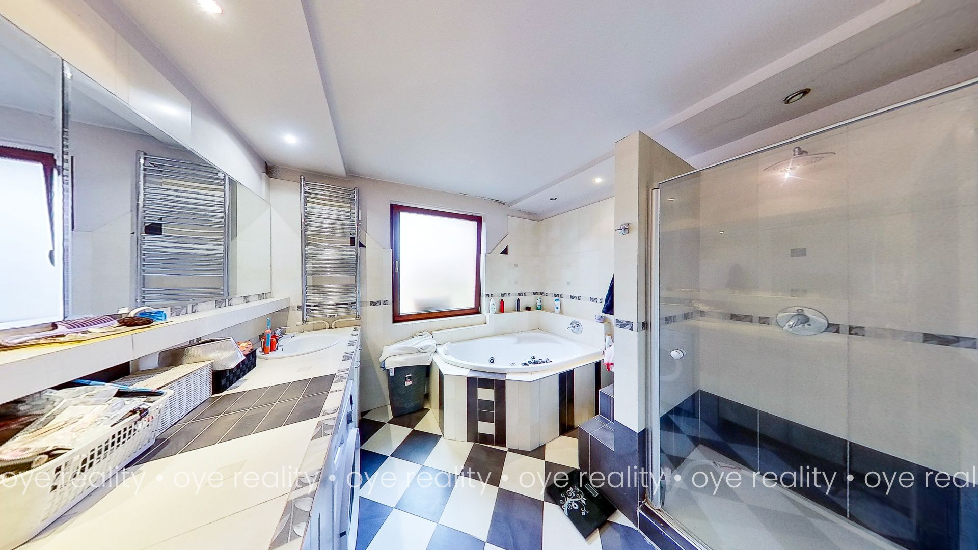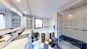 - kúpeľňa s rohovou vaňou, sprchovým kútom a dvoma umývadlami